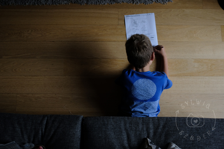 …i otrzymałam taki kadr. Całkiem nieźle – ładne światło na buzi Jasia, ręka w ruchu. W sumie mogłabym na tym skończyć, ale chciałam pokazać nie tylko to, że Jaś odrabiał lekcje na podłodze, ale też to, że leżał pod kanapą. A jak to najlepiej zrobić? Oczywiście…